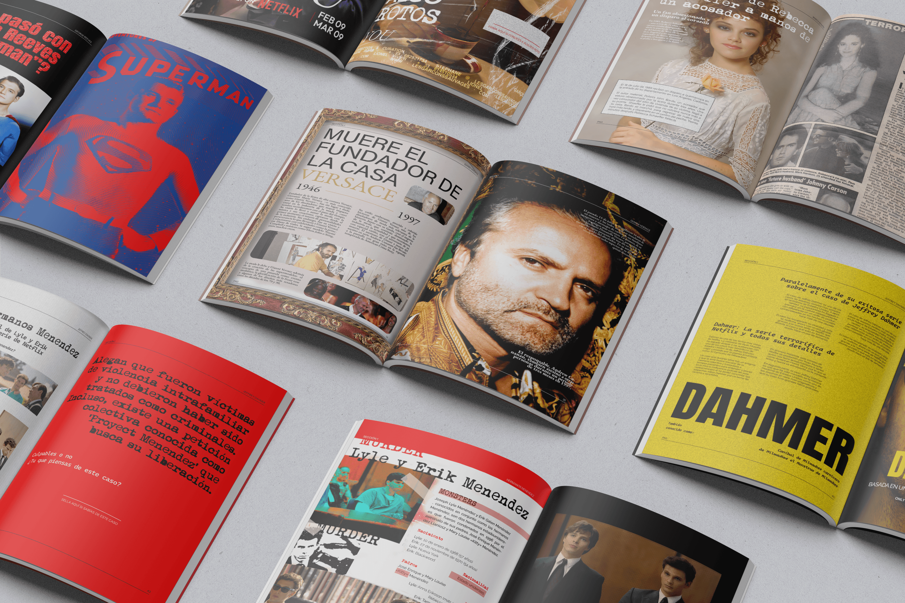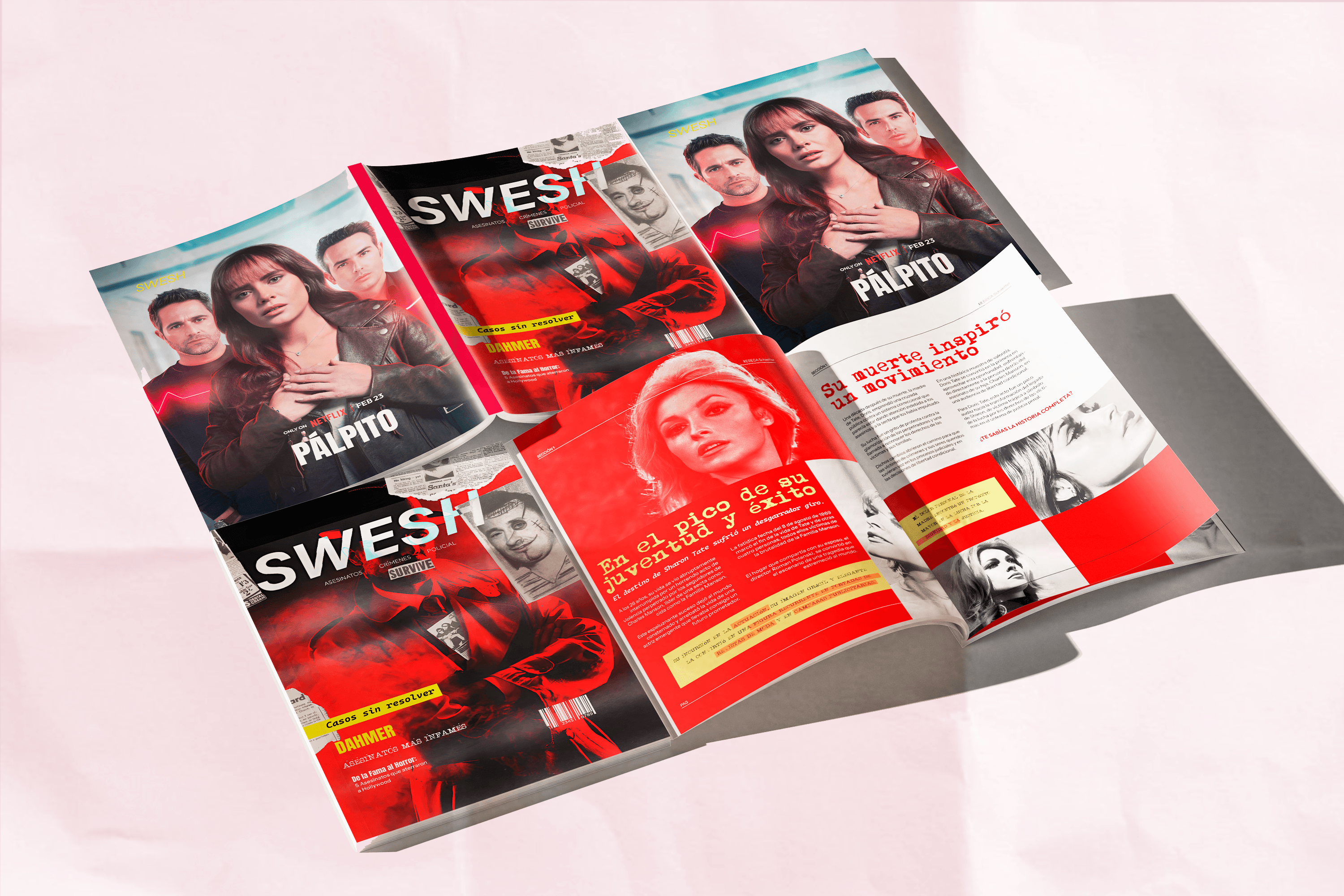 Hoy diseñé para el lado oculto de la fama. SWESH no es una revista convencional: es un archivo visual, una colección de secretos, una narrativa gráfica sobre los crímenes que marcaron la historia de Hollywood. Desde asesinatos sin resolver hasta escándalos que estremecieron la industria, cada página debía sentirse como una pieza de evidencia. Diseñar SWESH fue como entrar en una sala de interrogatorio: luces bajas, tensión en el aire, cada detalle cargado de significado. Nota de autor
